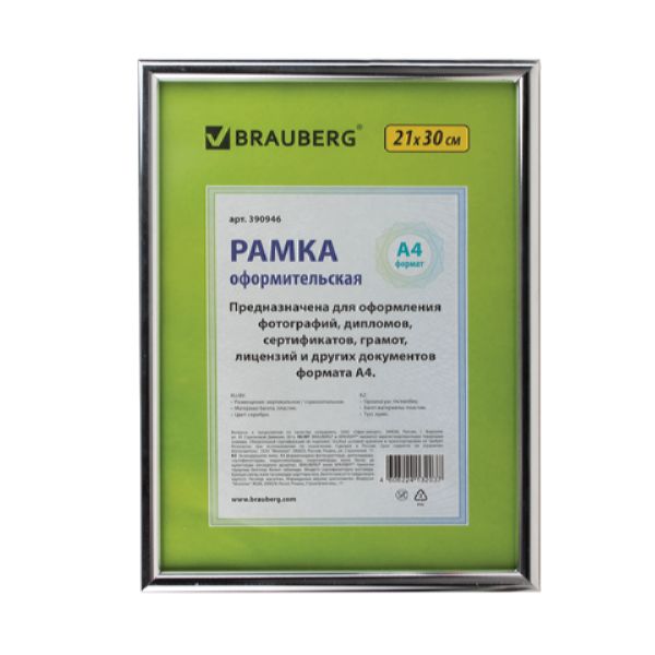 Рамка BRAUBERG HIT2 21*30см, пластик, серебро (д/дипломов, сертификатов, грамот, фото), 390946