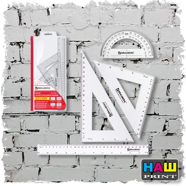 Набор чертежный большой BRAUBERG "Сrystal" (линейка 30см, 2 угольника,трансп.) выдел.шкала, 210297