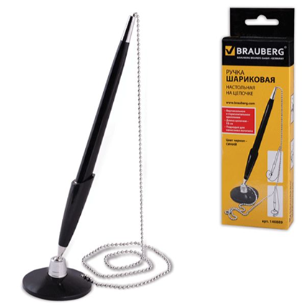 Ручка шариковая настольная BRAUBERG "СТЕНД-ПЕН БЛЭК1" на цепочке, с клейк.основ.,корп.чер,140889,син